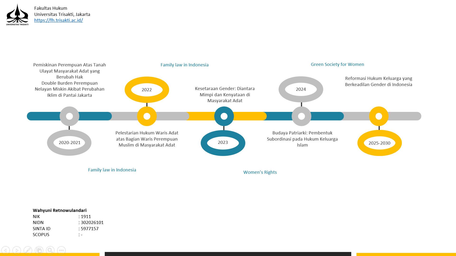 Wahyuni Retnowulandari merupakan dosen tetap Fakultas Hukum Universitas Trisakti dengan peminatan Hukum dengan peminatan Hukum Islam, Hukum Waris Islam, Perempuan dan Anak dalam Hukum, Pengantar Ilmu Hukum.